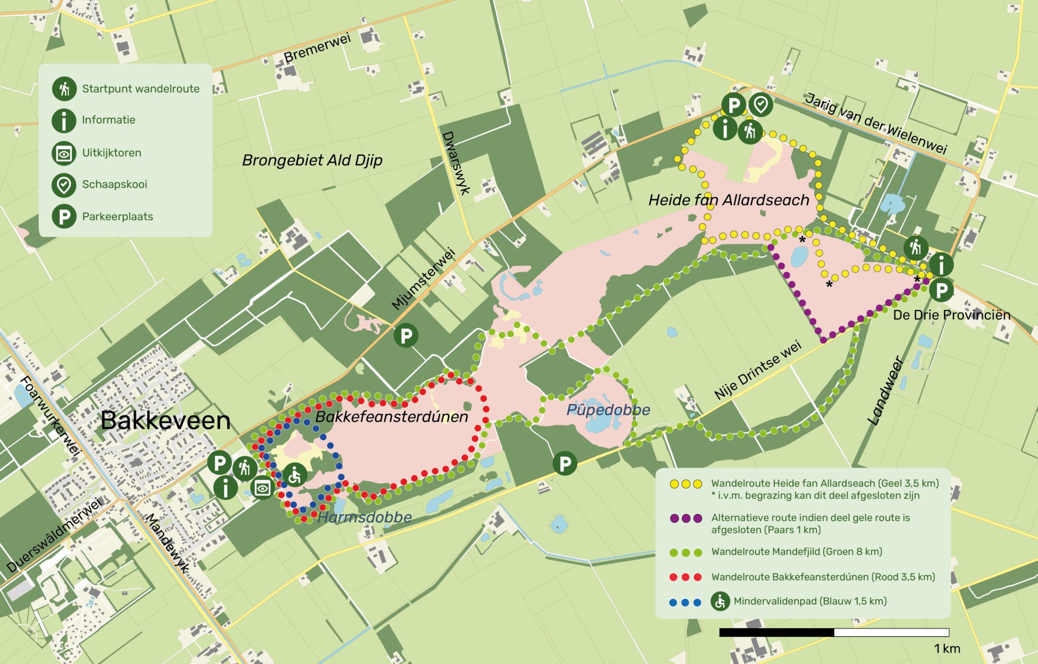 Het gebied bestaat uit De Bakkefeansterdunen, het Mandefjild en de Heide fan Allardseach. Tussen zonsopkomst en zonsondergang zijn de wandelpaden en zandvlakte vrij toegankelijk.