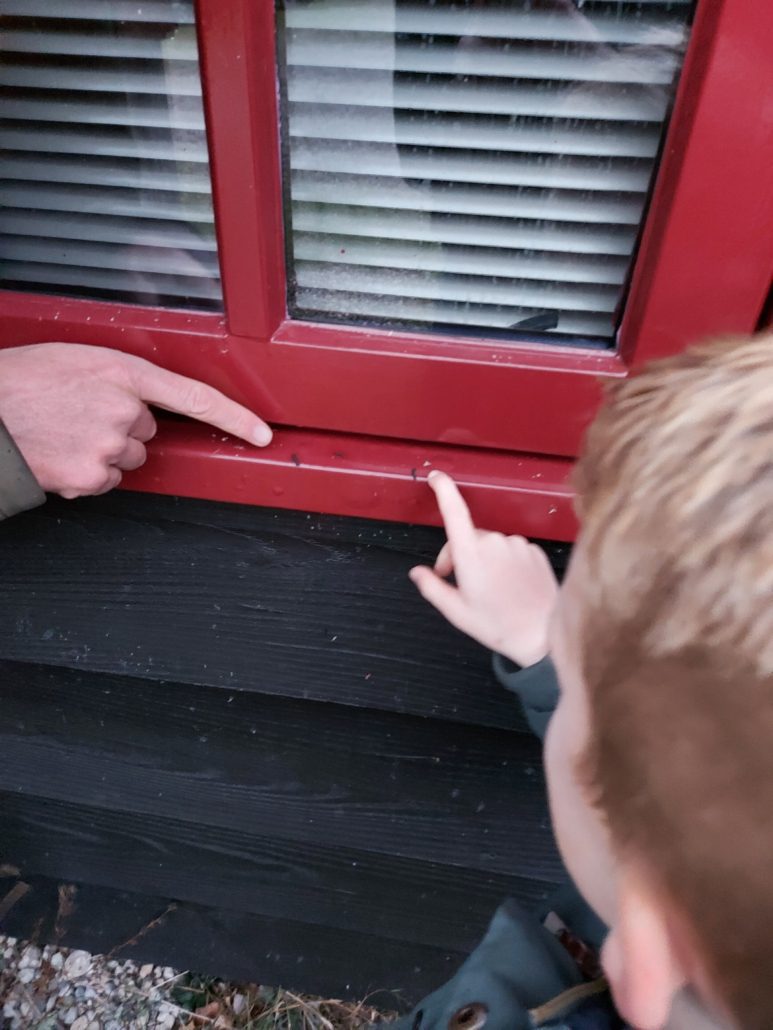 Geareporter Noah en vleermuizenexpert Marten ontdekten dat er onder de invliegopeningen heel veel vleermuispoepjes liggen! Marten wees Noah op de ‘hagelslagjes’ op de kozijnen, waarop Noah zich afvroeg “kan ik dat op m’n brood doen?”. Dat lijkt ons niet verstandig Noah!